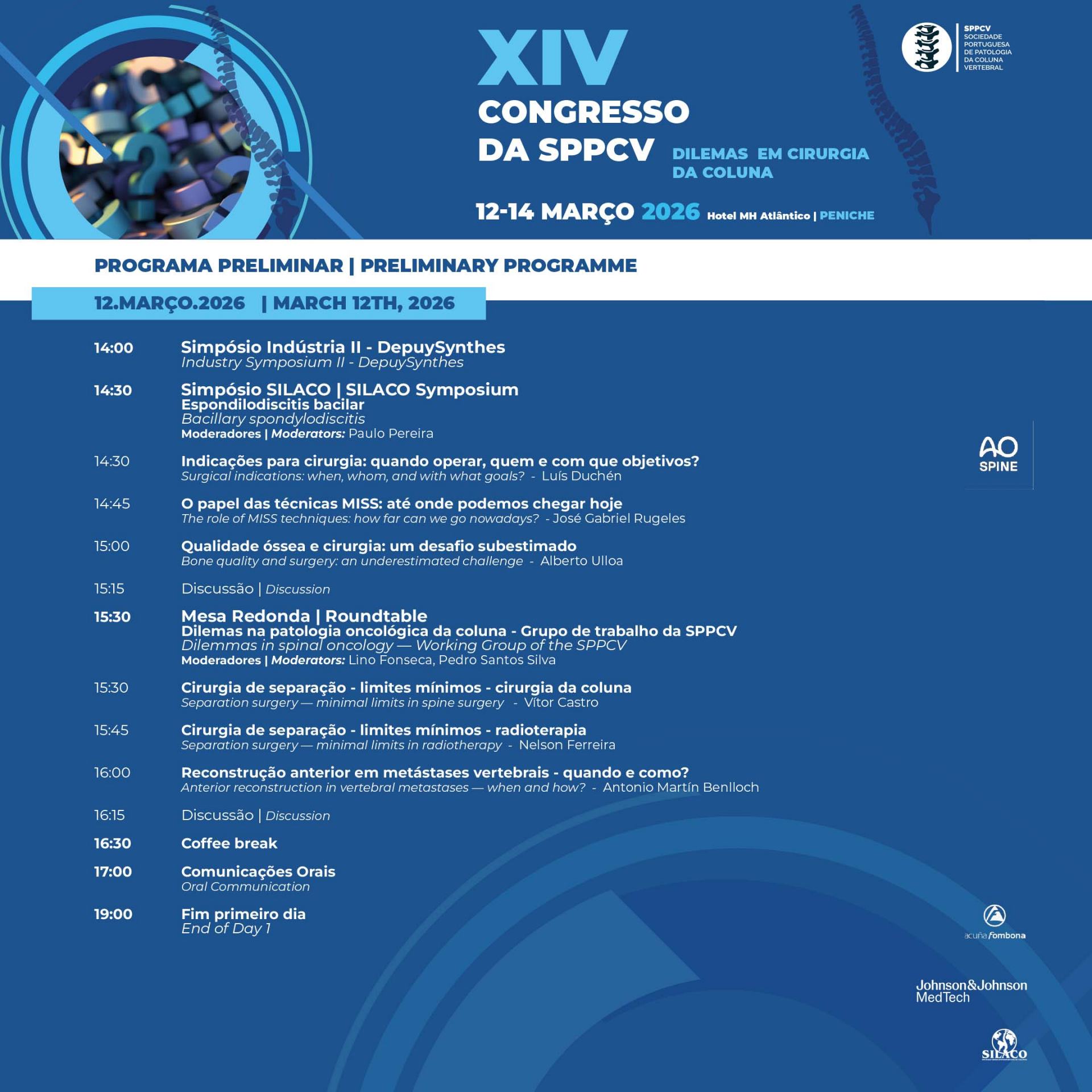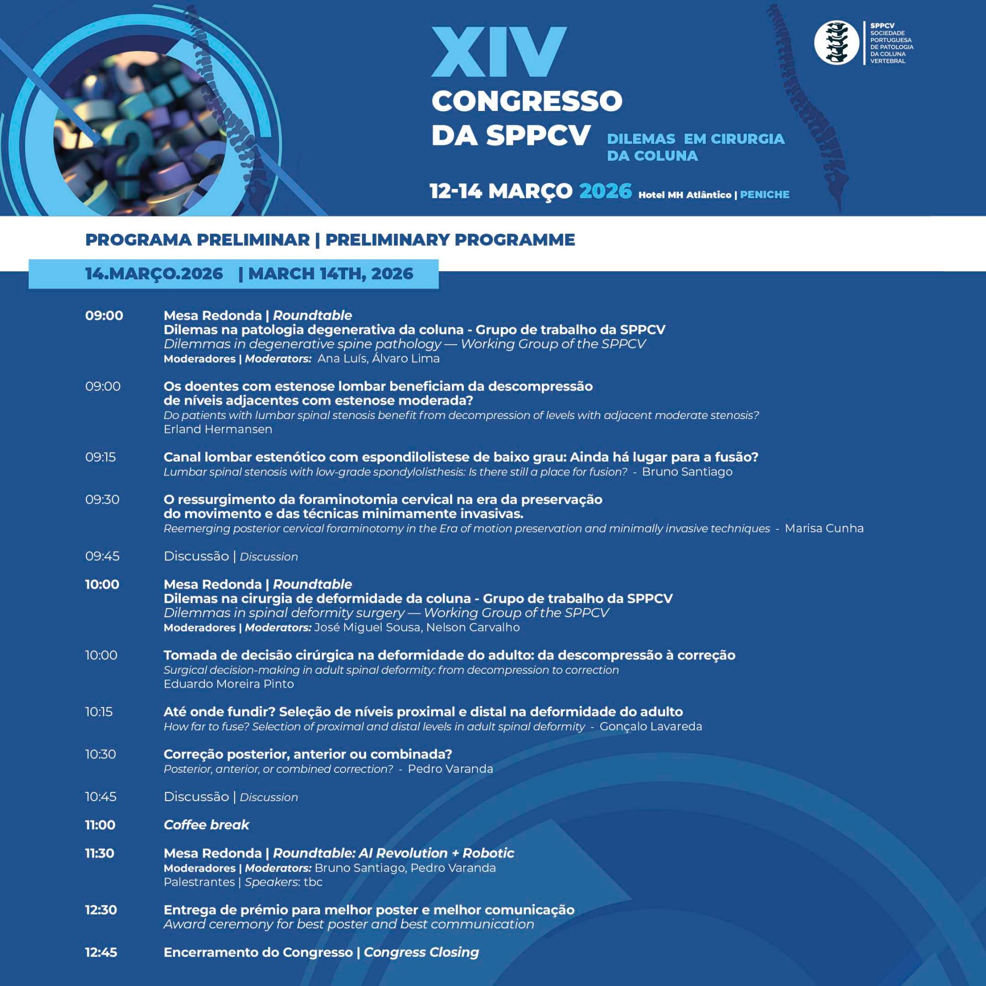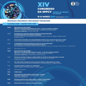 A Sociedade Portuguesa de Patologia da Coluna Vertebral (SPPCV) anuncia que já se encontra disponível o programa preliminar do XIV Congresso Nacional, que se realiza de 12 a 14 de março, em Peniche.