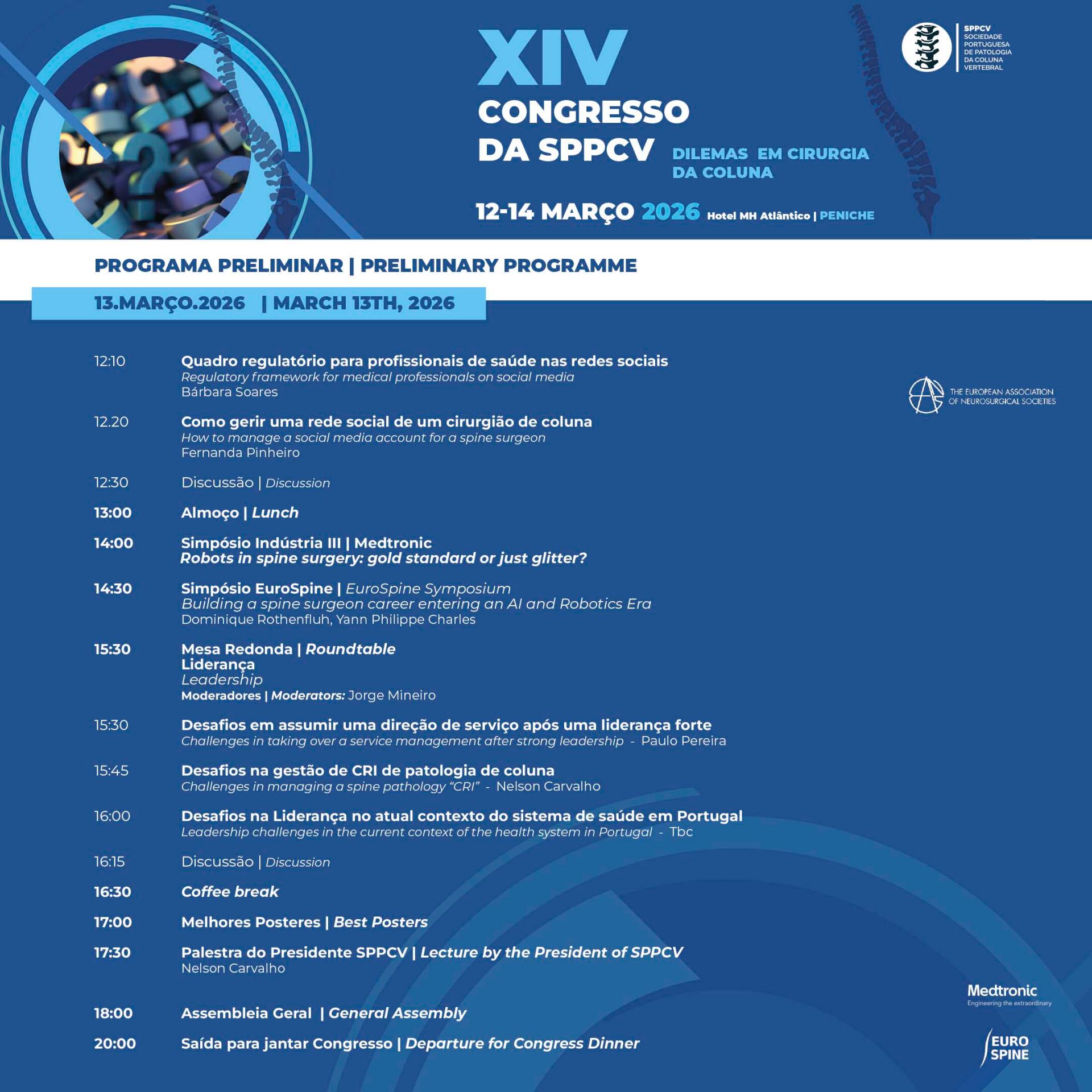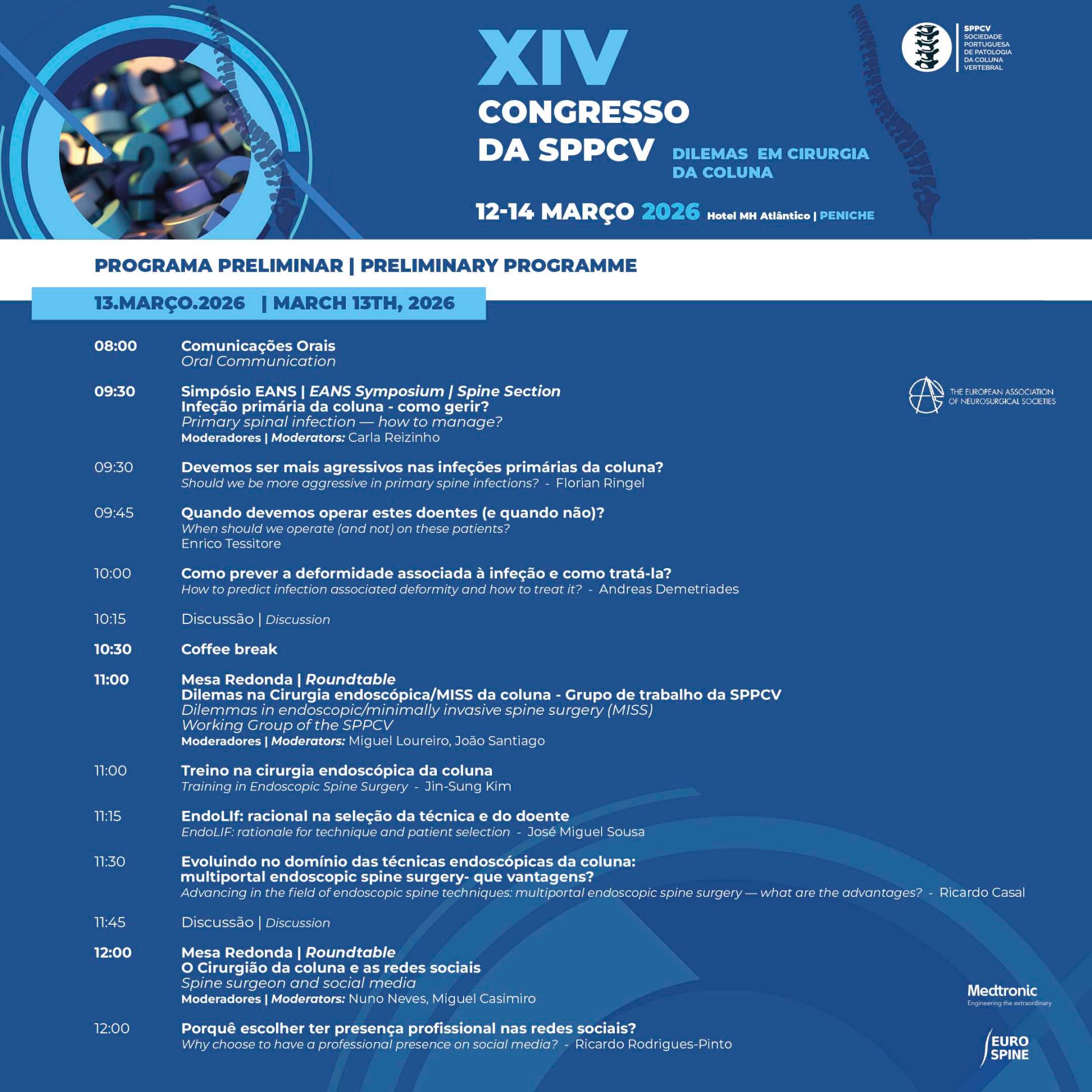O evento reúne especialistas, investigadores e profissionais da área da coluna vertebral, oferecendo um espaço de debate sobre os avanços clínicos, cirúrgicos e de investigação na área. O programa preliminar inclui palestras, mesas-redondas, apresentações de casos clínicos e workshops, permitindo aos participantes planear a sua presença de acordo com os temas de maior interesse.
