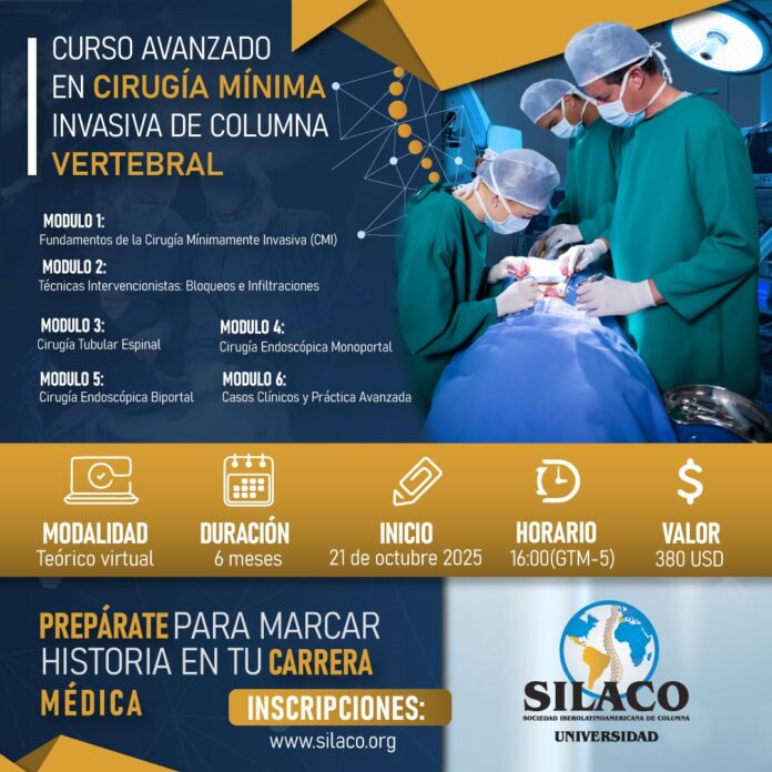 A Sociedad Iberolatinoamericana de Columna (SILACO) anuncia o lançamento do Curso Avançado em Cirurgia Minimamente Invasiva da Coluna Vertebral, com início previsto para 21 de outubro de 2025. O curso terá a duração de seis meses e será totalmente online.